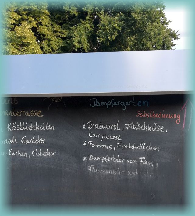 Der sich auf dem Gelände befindliche Biergarten mit Selbstbedienung bietet auch schattige Plätze unter Bäumen. Wie wäre es mit Dampferbier vom Fass?