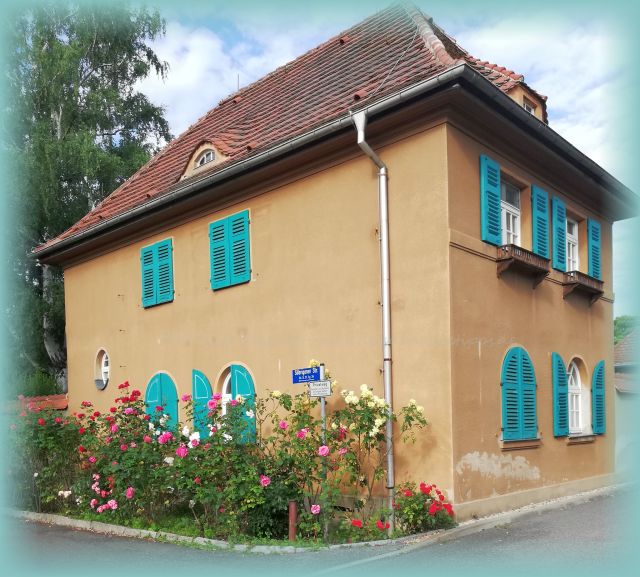 Ich fuhr gut gelaunt bei herrlichem Sonnenschein die Söbrigener Straße entlang und entdeckte dabei zufällig aus den Augenwinkeln ein hübsches Häuschen mit türkisfarbenen Fensterläden. Es zog mich magisch in den Bann, sodass ich gar nicht anders konnte, als meine Radtour entlang der Elbe zu unterbrechen. Schnell vom Sattel gehüpft und erst einmal ein paar Fotos von der Umgebung gemacht, bevor ich auf das von Rosen umsäumte Haus mit den auffälligen Fensterläden zusteuerte. An den bevorstehenden Pillnitzer Gartentag dachte ich da nicht, zumal ich bis dato ohnehin noch nie etwas davon gehört hatte. Fahrradtouren stecken eben voller Überraschungen.